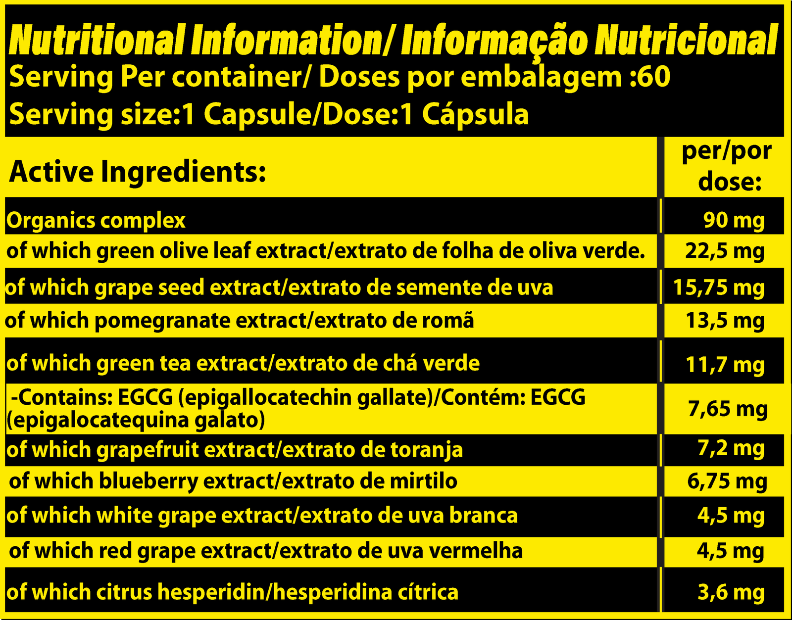 Waxy Maize Corn Starch, Capsule Shell (Hypromellose), Olea europaea L., Vitis vinifera L., Punica granatum L., Camellia sinensis L. Kuntze, Citrus paradisi Macfad., Vaccinium myrtillus L., Vitis vinifera L., Citrus sinensis L. Osbeck.