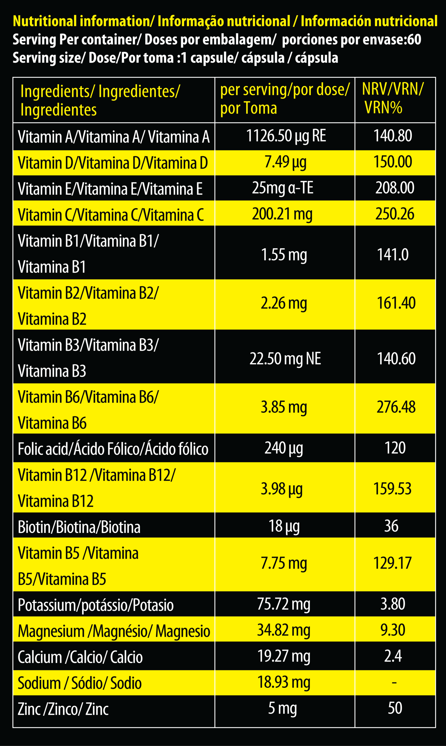 Vitamins and Minerals Blend (L-Ascorbic Acid, Calcium Carbonate, Magnesium Oxide, Nicotinamide, Calcium D-Pantothenate, Ferrous Sulfate, DL-α-Tocopheryl Acetate, Choline Hydrogen Tartrate, Zinc Oxide, Inositol, Beta-Carotene, Pyridoxine Hydrochloride, Thiamine Mononitrate, Riboflavin, Manganese Sulfate, Cupric Sulfate, Pteroilmonoglutamic Acid, Potassium Iodide, D-Biotin, Cyanocobalamin, Maltodextrin),
